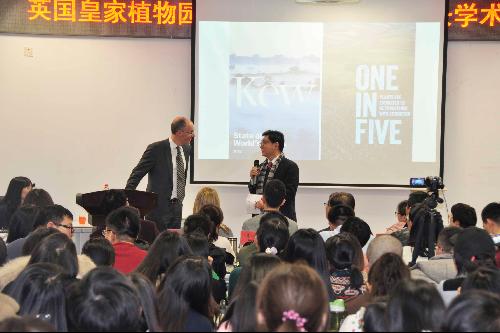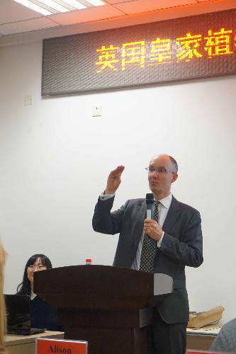 Richard园长首先介绍了邱园的历史、十大特色景观以及邱园在植物科研、园艺、植物收集保育方面的成果,展示了邱园美景及其丰富的物种资源。随后, Richard阐述了大数据在植物学领域应用和建立植物数据库的重大意义。他指出,大数据最新研究表明,科学界已知高等植物种类约为39.1万种,现已应用于人类活动的植物种类约为3.2万种,尚有21%的植物种类面临灭绝危险,因此,人类应当深入开展对植物功能的研究和物种多样性保护。Richard介绍了邱园利用DNA分析和计算机技术正在筹建的大型植物数据库,收录了植物学名、别名、特征、遗传特性等生物学信息,为植物学相关领域研究提供大量基础性数据和丰富的全球共享资源。