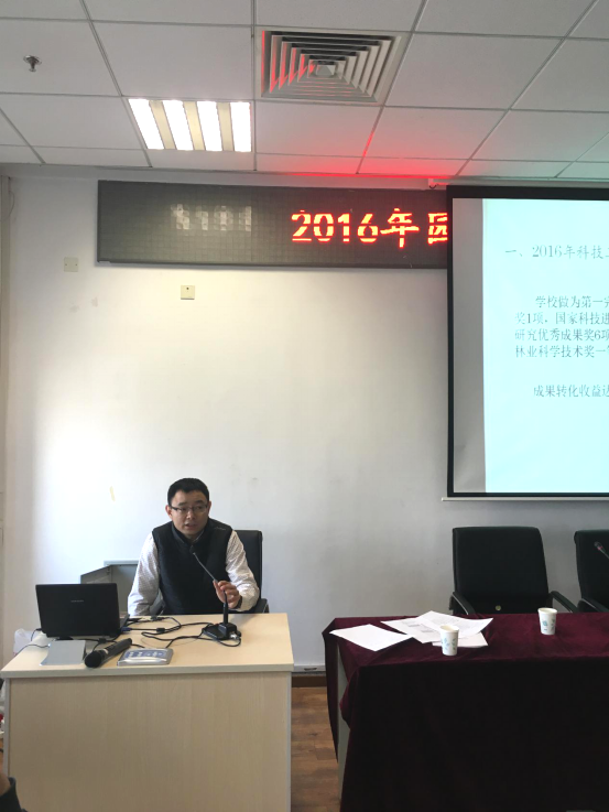 王立平处长对我校2016年科技工作进行了总结。通过详细的统计数据分析了北京林业大学和园林学院2016年取得的科研成果,对园林学院取得的成绩给予充分肯定,同时强调要落实“放管服”,激发创造力,指出学校科研工作的进展离不开行业的依托,学校紧紧抓住服务林业的大命题,抢抓机遇,力争开创科技工作新局面。