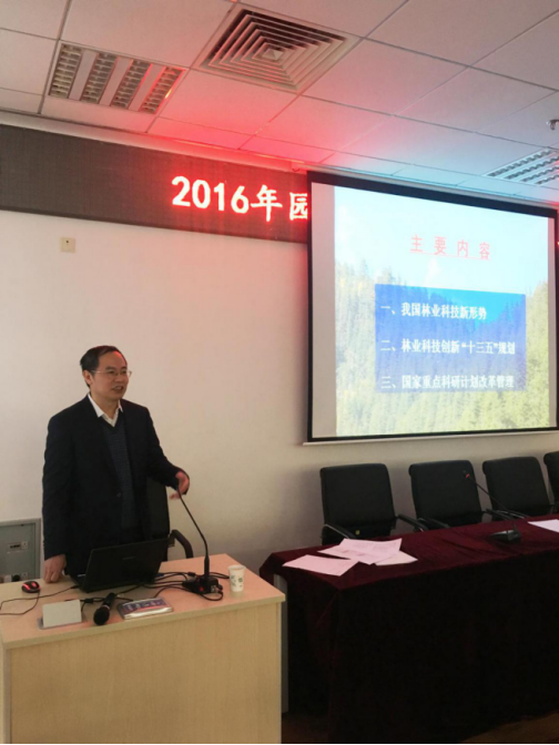 随后,杜纪山副司长围绕“新时期林业科技工作的思考”这一主题做了报告,就我国林业科技新形势、林业科技创新“十三五”规划以及国家重点科研计划改革管理这三个主题进行了详细阐述,对现阶段国家林业及相关科研领域的政策、形势和重点进行了解读。